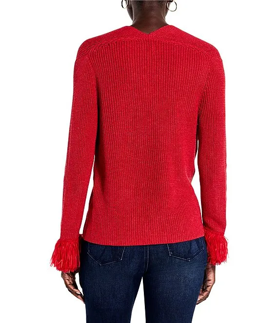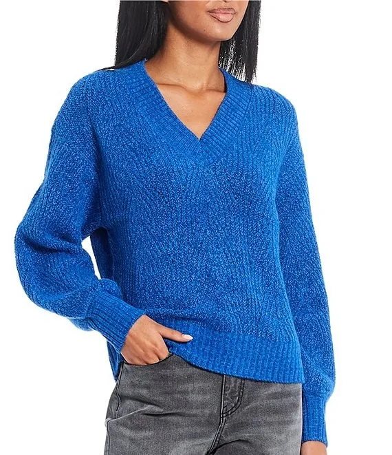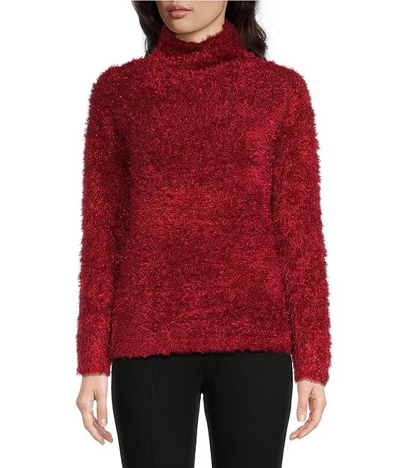 Long Sleeve Split Mock Neck Metallic Chenille Sweater
