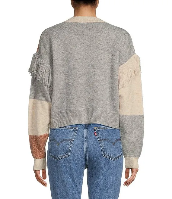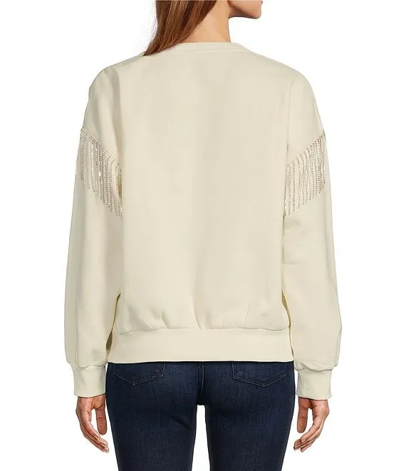 Crew Neck Long Sleeve Rhinestone Fringe Pullover