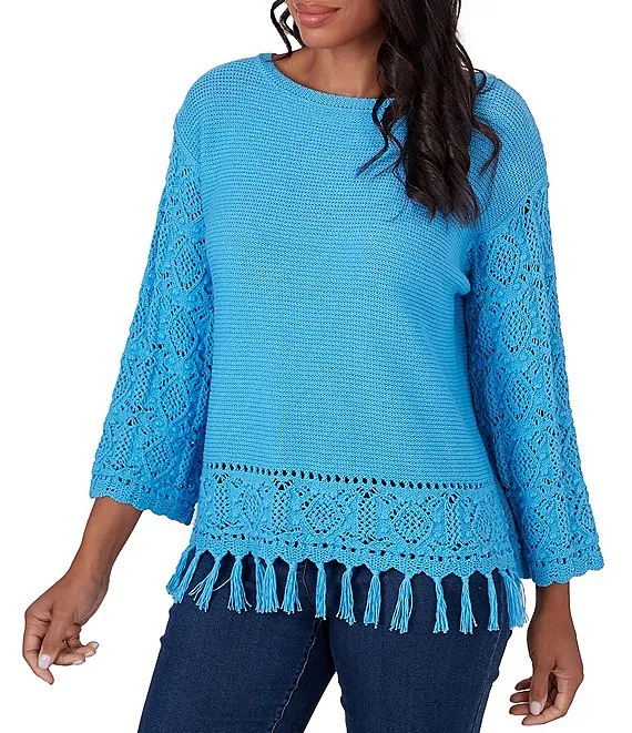 Boat Neck 3/4 Flare Sleeve Fringe Hem Pullover Sweater Top