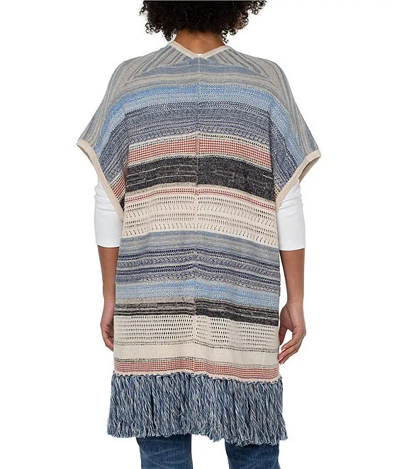 Striped Print Sweater Knit Open Front Short Sleeve Fringe Hem Cardigan