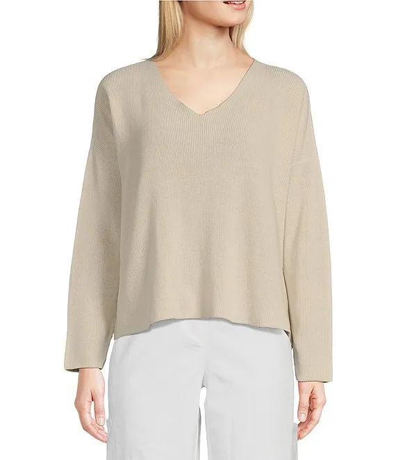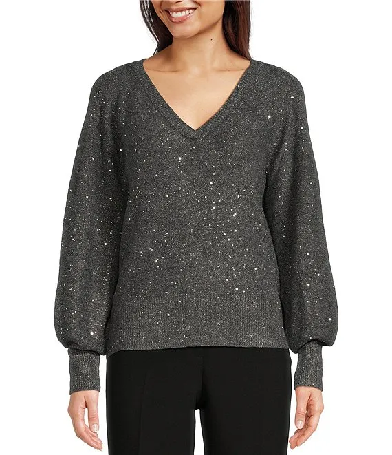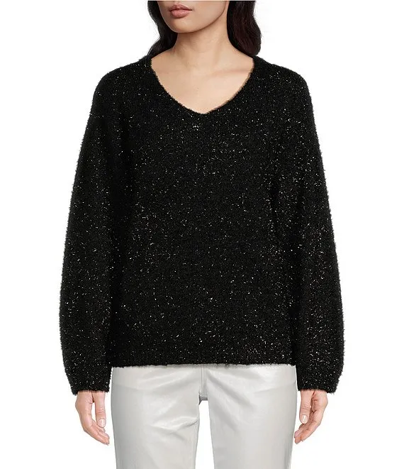 Sparkle Metallic Knit V-Neck Long Sleeve Fitted Sweater