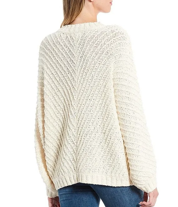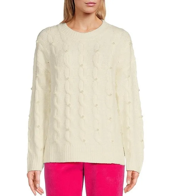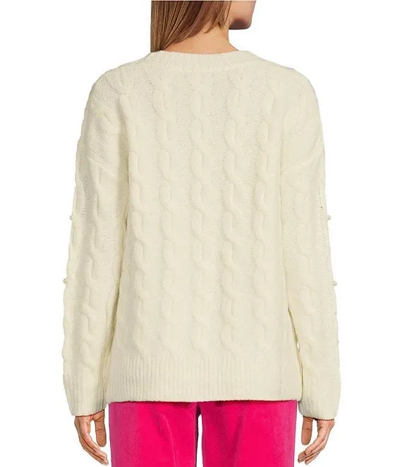 Cable Knit Wool Blend Pearl Crew Neck Long Sleeve Sweater