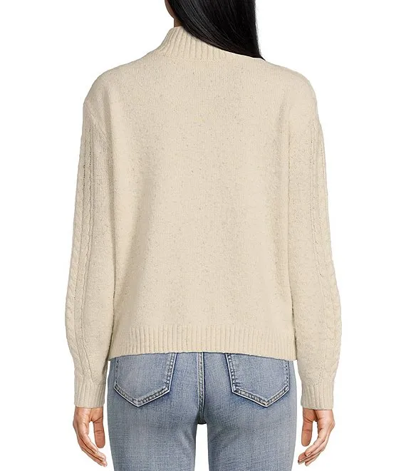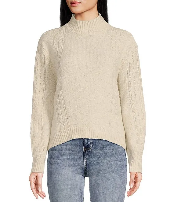 Mock Neck Lurex Wool Blend Cable Knit Sweater