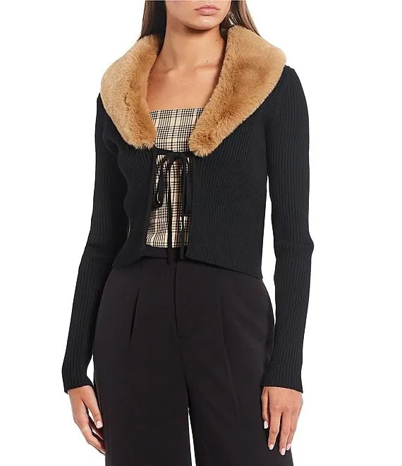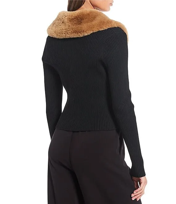 Knit Cowl Neck 3/4 Sleeve Faux Fur Trim Poncho