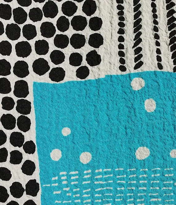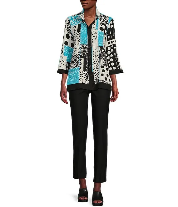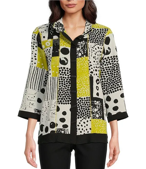 Abstract Patchwork Print Wire Collar 3/4 Sleeve Button-Front Tunic