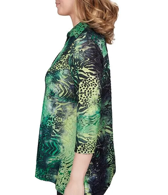 An exotic animal print in an array of easy colors gives this burnout top its distinctive personality. Highlighted with a point collar, button front and three-quarter-length sleeves.