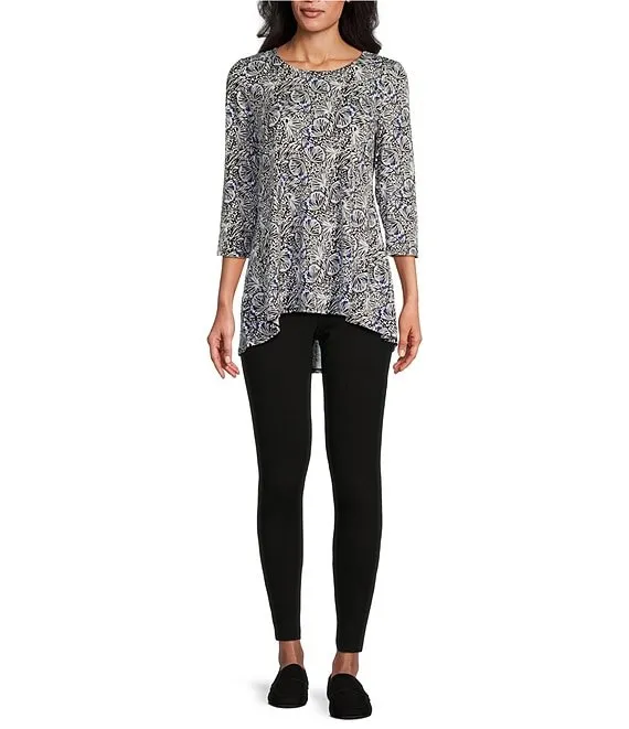 Butterfly Print Scoop Neck 3/4 Sleeve Pleated Back High-Low Hem Legging Tee Shirt