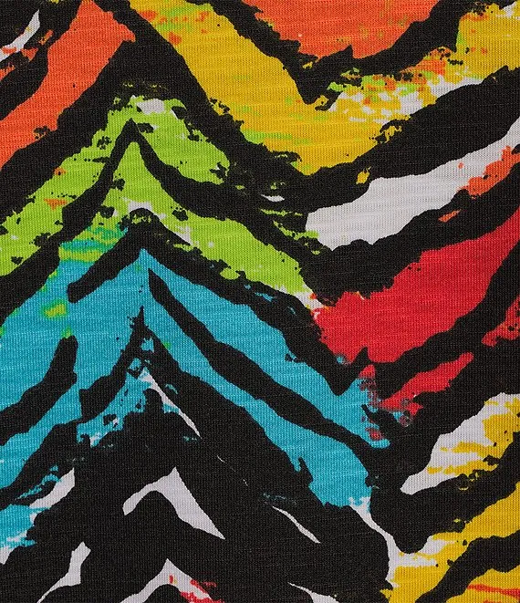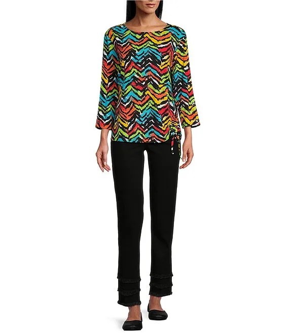 Chevron Print Slub Knit Boat Neck 3/4 Sleeve Drawstring Hem Top