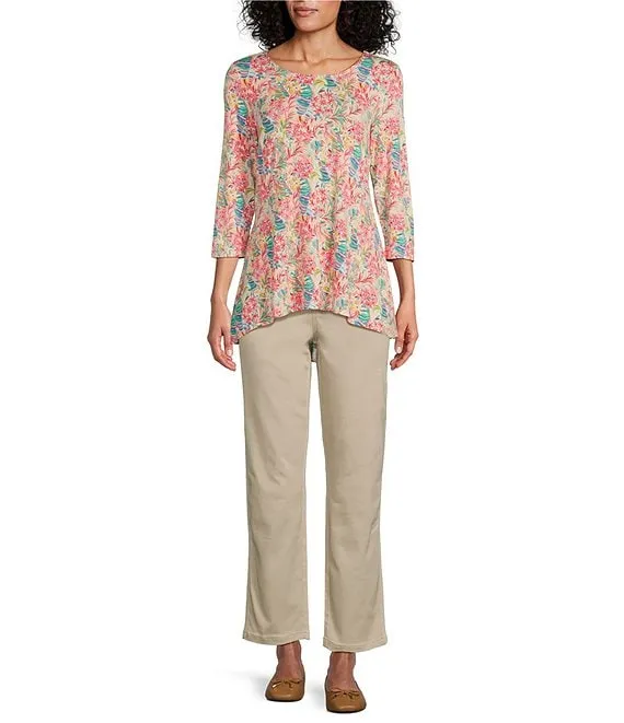 Desert Flower Print Scoop Neck 3/4 Sleeve Pleated Back High-Low Hem Legging Tee
