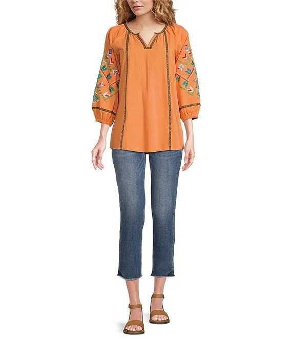 Embroidered Crinkled Floral Print Split-V Neck Long Sleeve Tunic