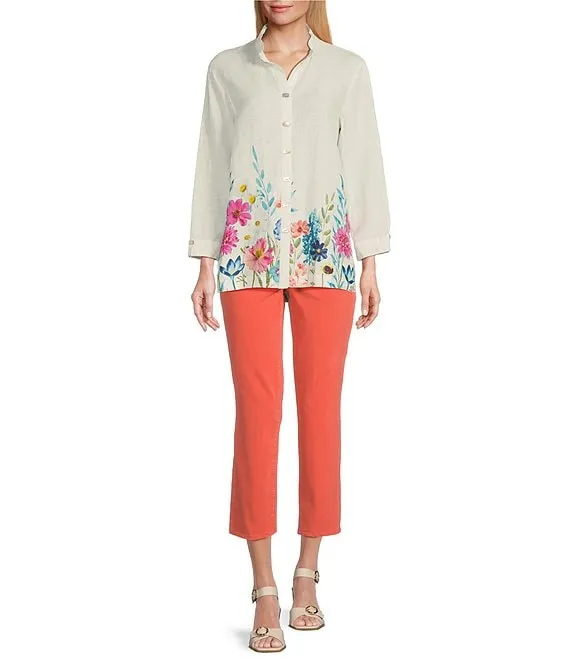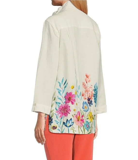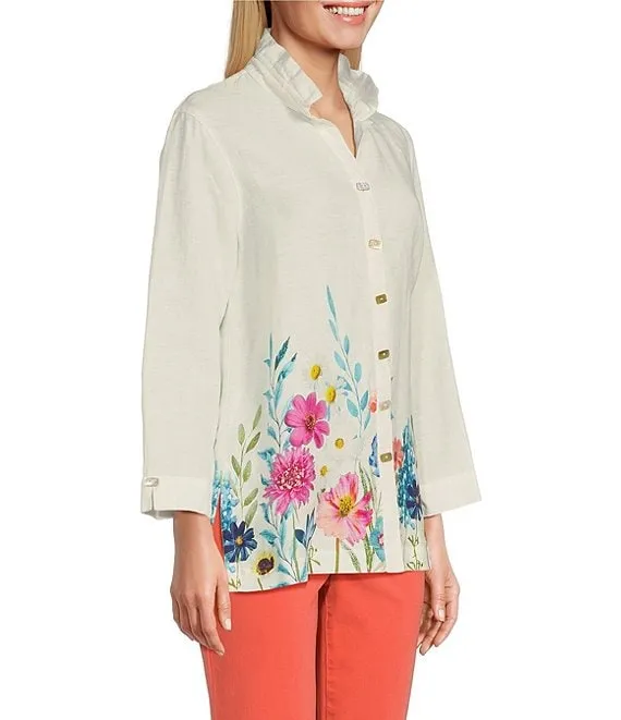 Floral Border Print Linen Wire Collar 3/4 Sleeves Button-Front Tunic