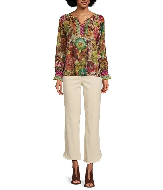 Floral Border Print Split Neck Flounce Cuff Long Blouson Sleeve Top