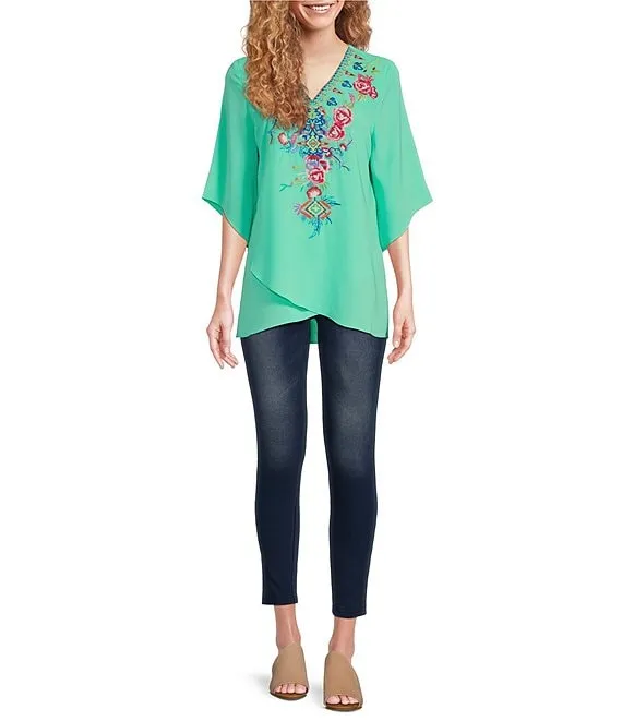 Floral Embroidered V-Neck 3/4 Sleeve Asymmetrical Crossover Hem Tunic