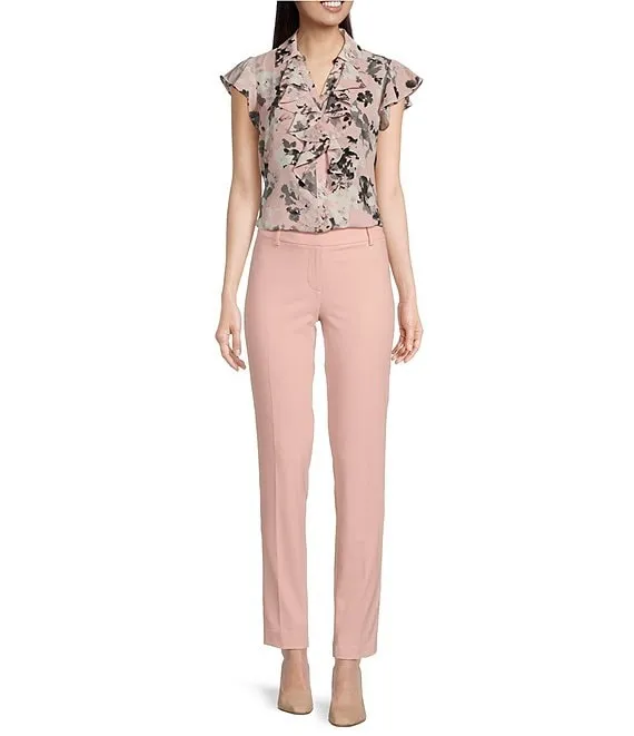Calvin Klein Floral Print Collared Ruffle Front Cap Sleeve Woven Top