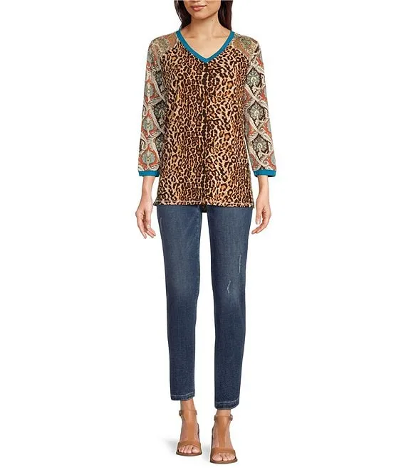 Jersey Knit Mixed Animal Print V-Neck 3/4 Sleeve Top