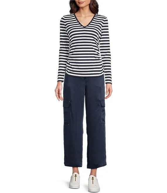 • MICHAEL Michael Kors Double Knit Ruched Stretch Stripe Print V-Neck Long Sleeve Top