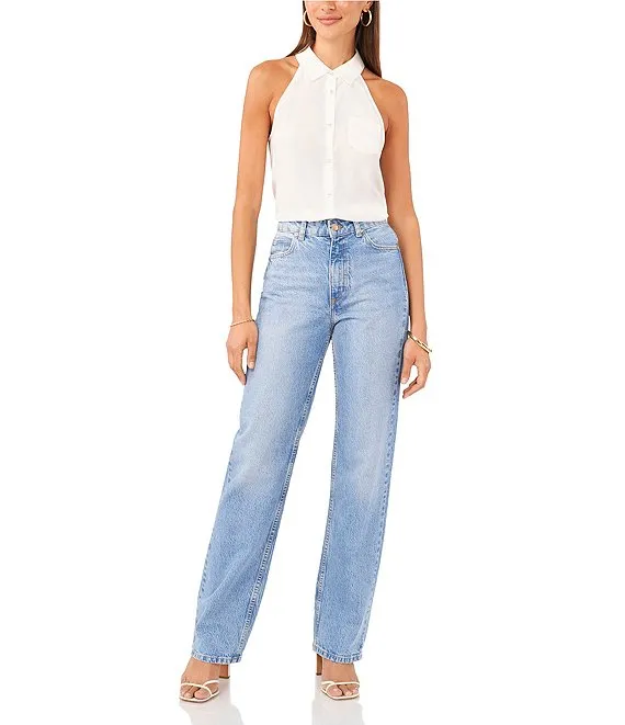 Point Collar Sleeveless Patch Pocket Button Front Blouse