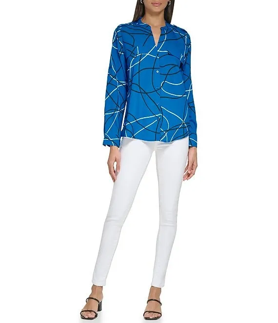 • Calvin Klein Printed Split V-Neck Long Roll-Tab Sleeve Button Front Blouse