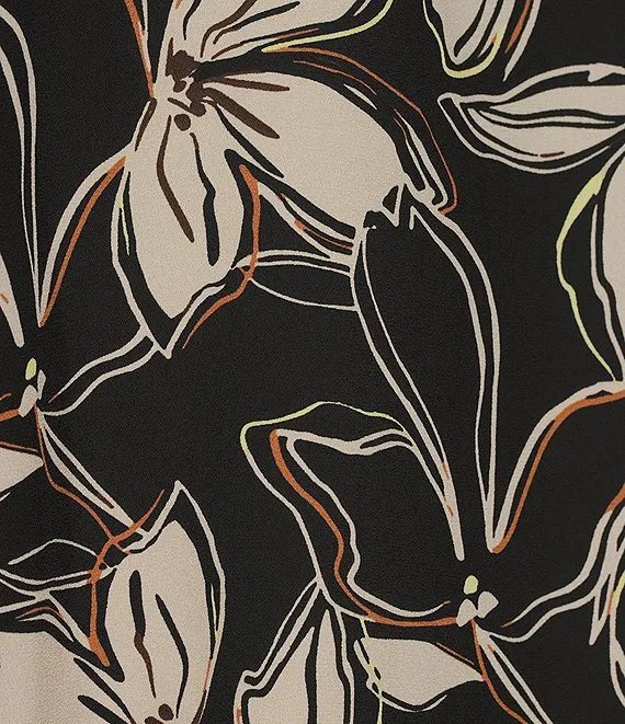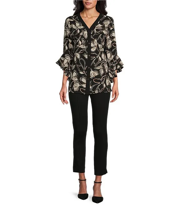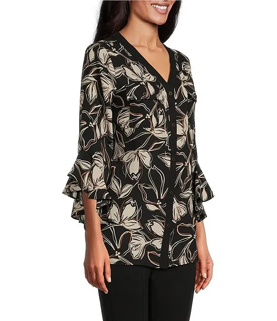 Slim Factor by Investments Floral Print V-Neck 3/4 Ruffle Sleeve Button Front Blouse