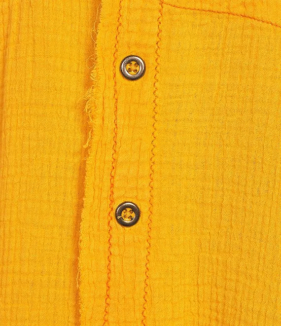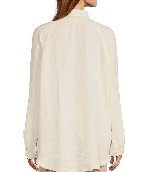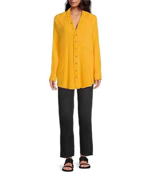 Summer Daydream Long Sleeve Button Front V-Neck Raw High-Low Hem Oversized Top