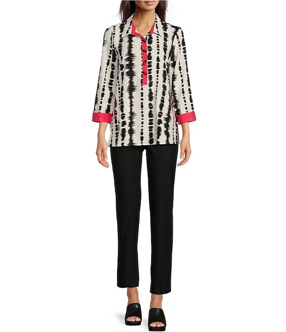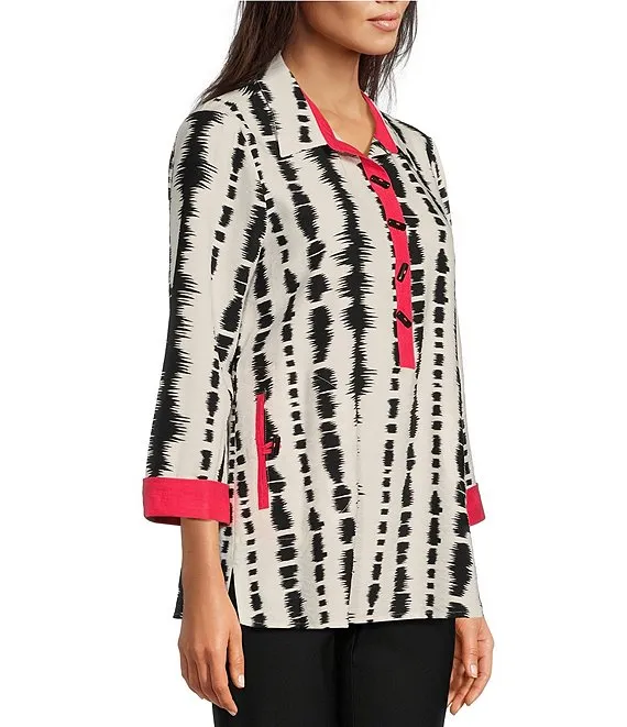 Woven Pop Over Point Collar Cuffed 3/4 Sleeve Button Placket Printed Tunic
