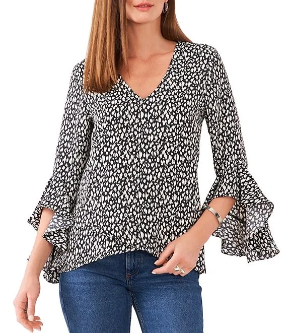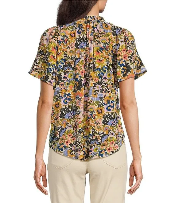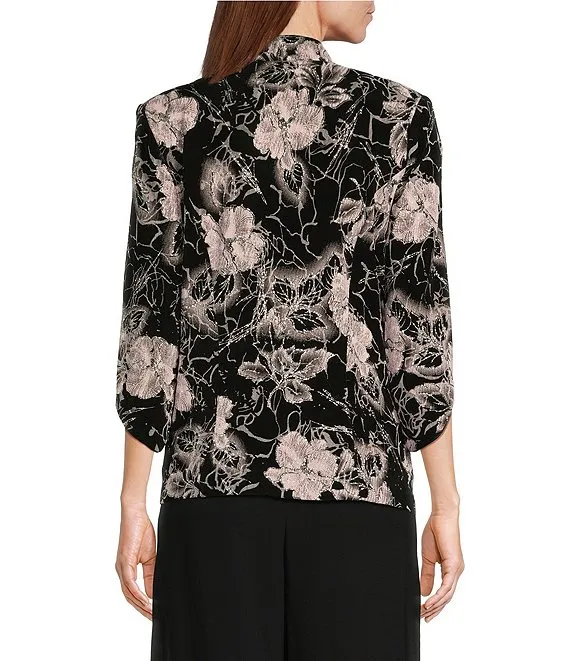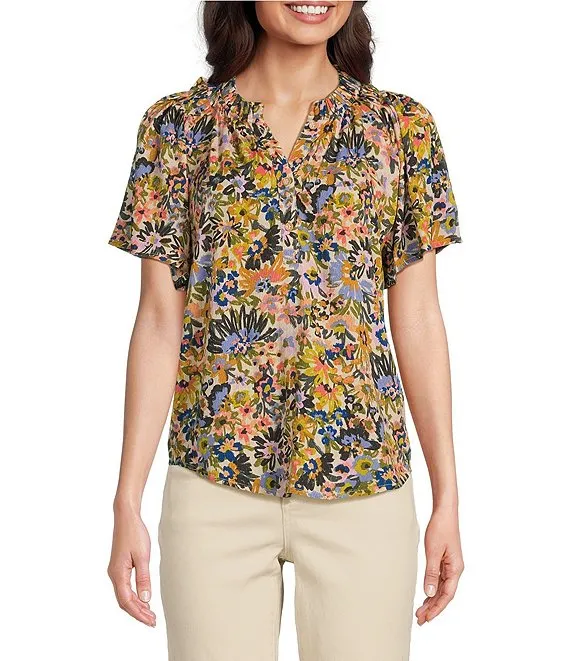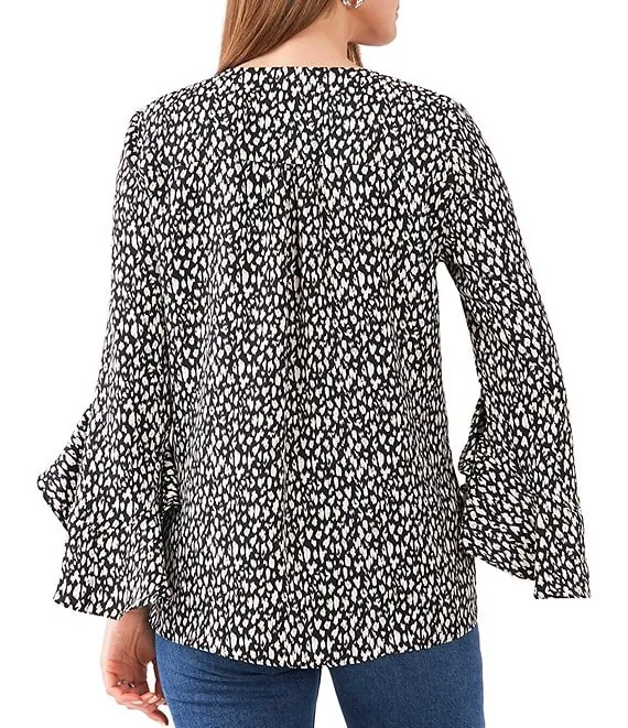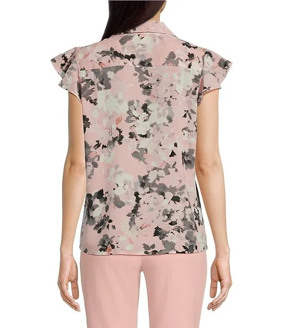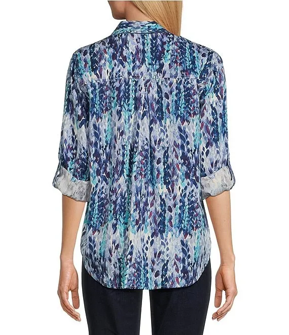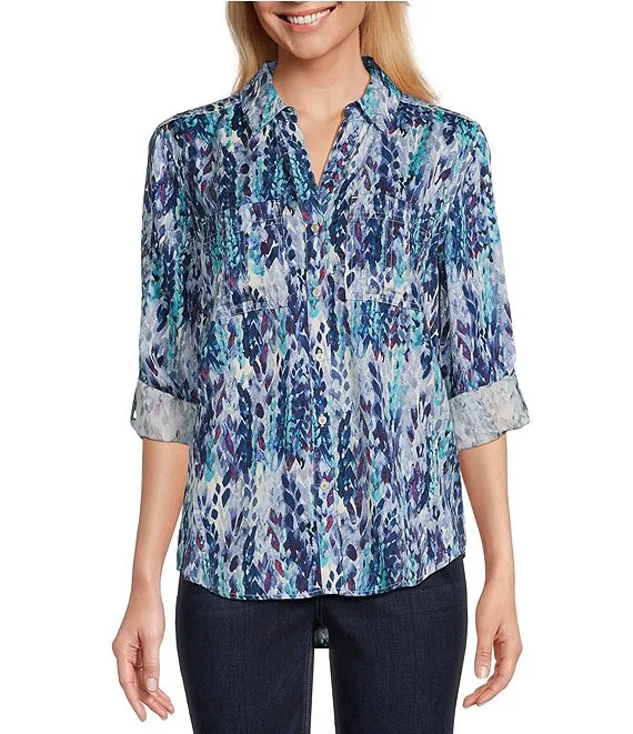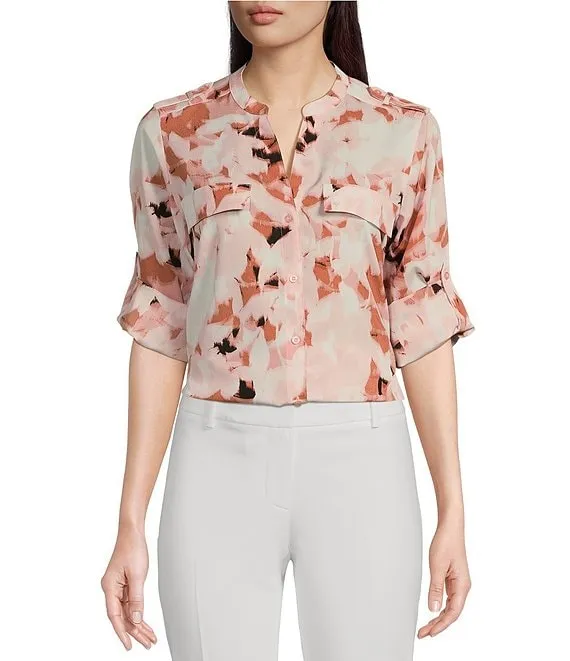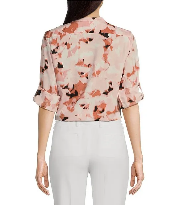 Woven Petal Print Roll Tab Long Sleeve V-Neck Button Front Top
