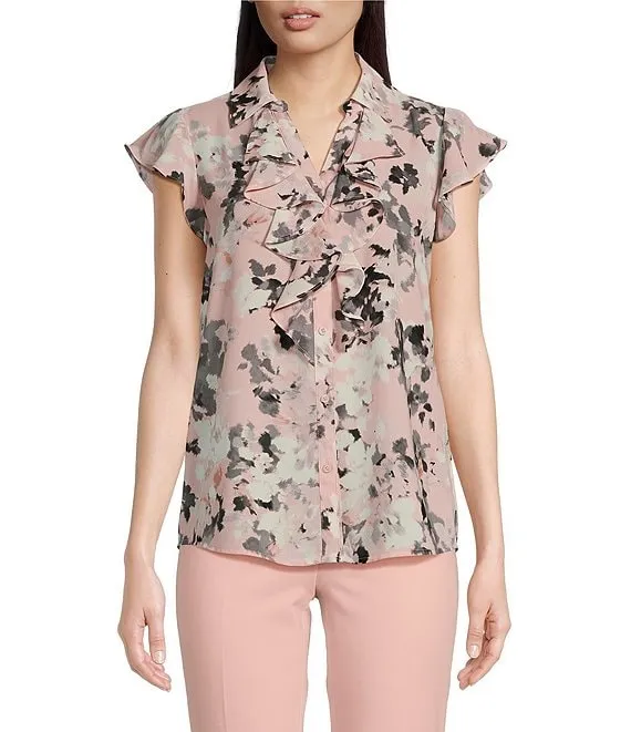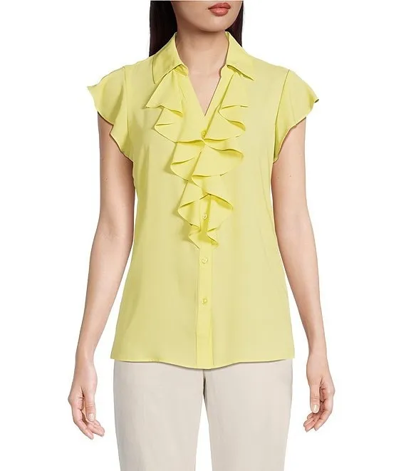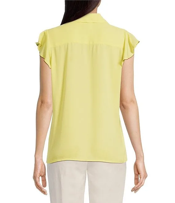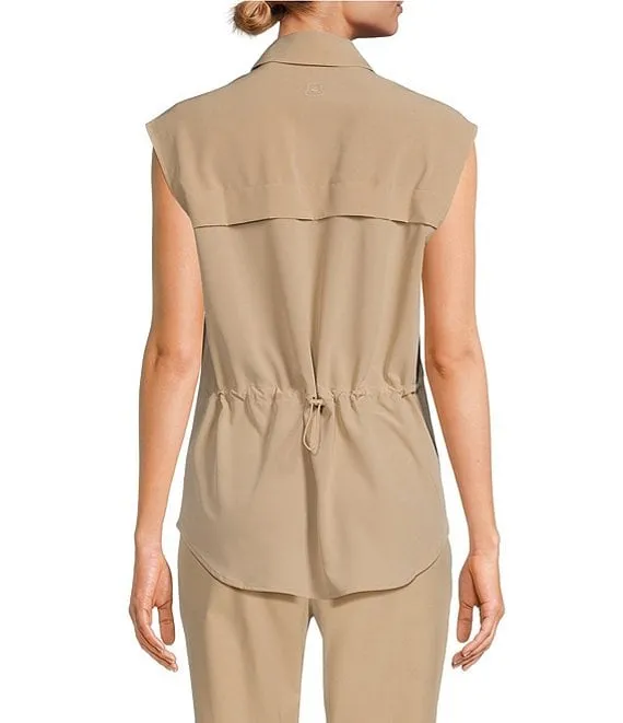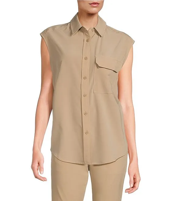 Tech SLK Performance Silk-Like Woven Point Collar Cap Sleeve Button-Front Shirt