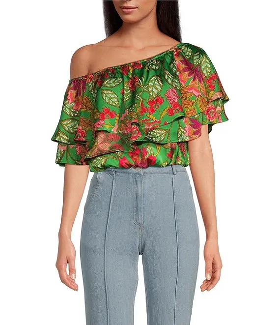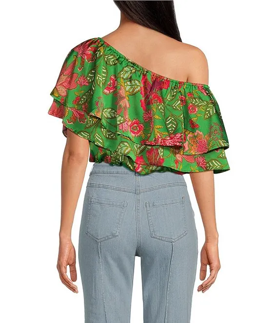 Charmer Tropical Floral Print Tiered Off-The-Shoulder Cropped Ruffle Top