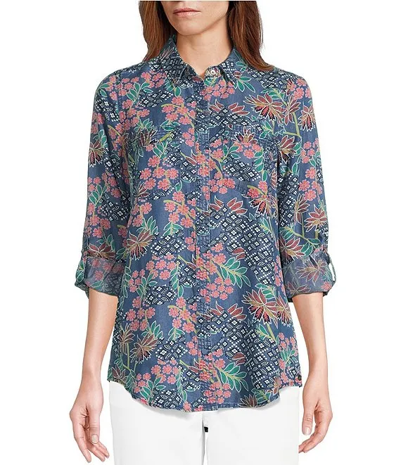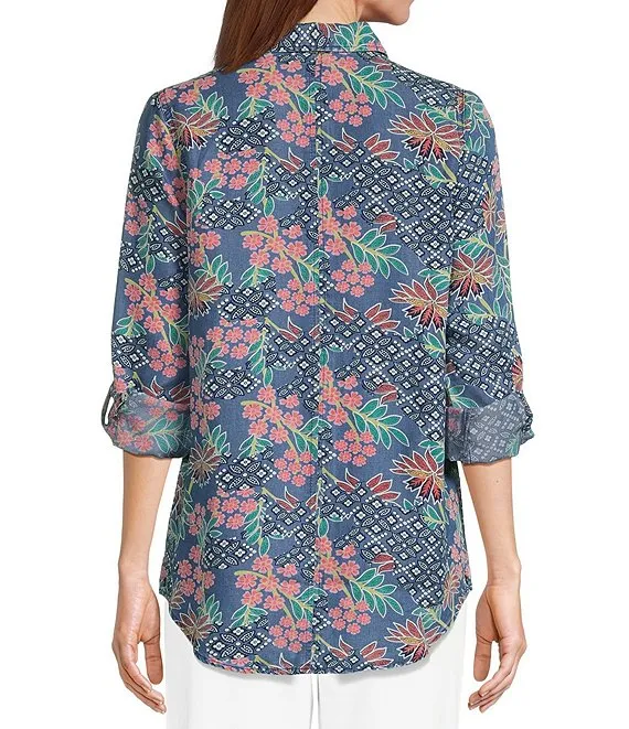 Floral Geometric Mix Print Long Roll-Tab Sleeve Button Front Point Collar Tencel Shirt