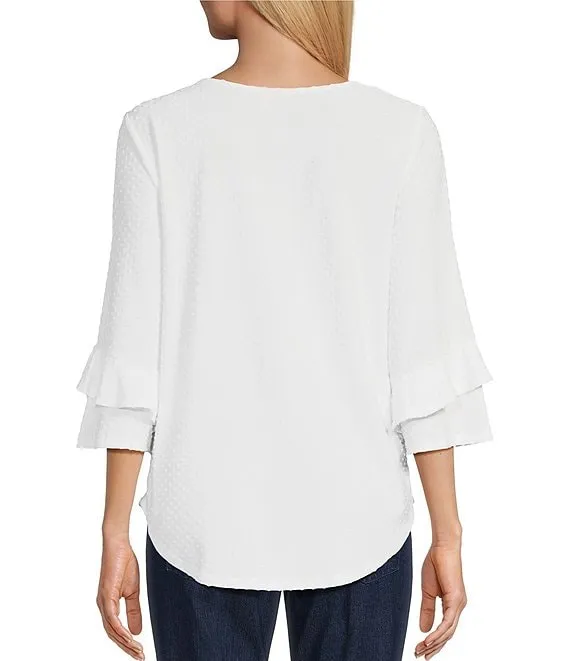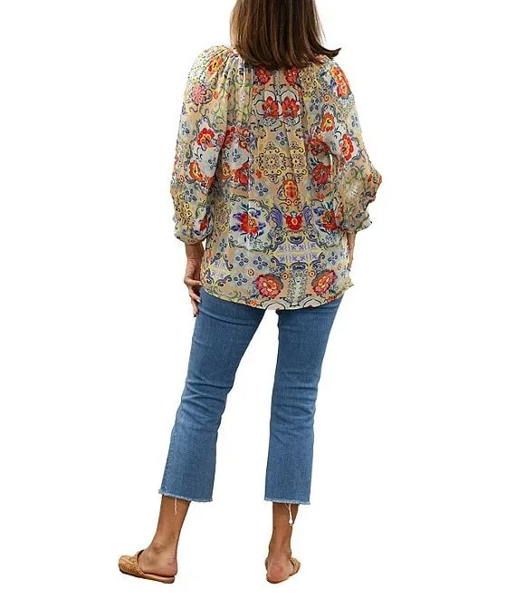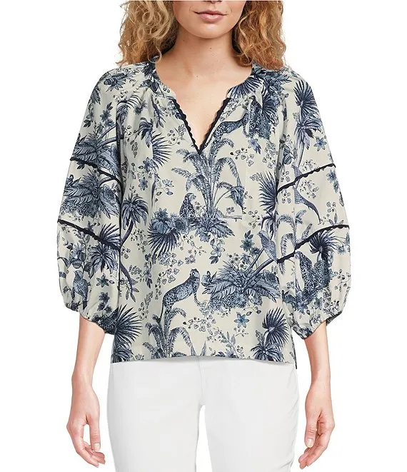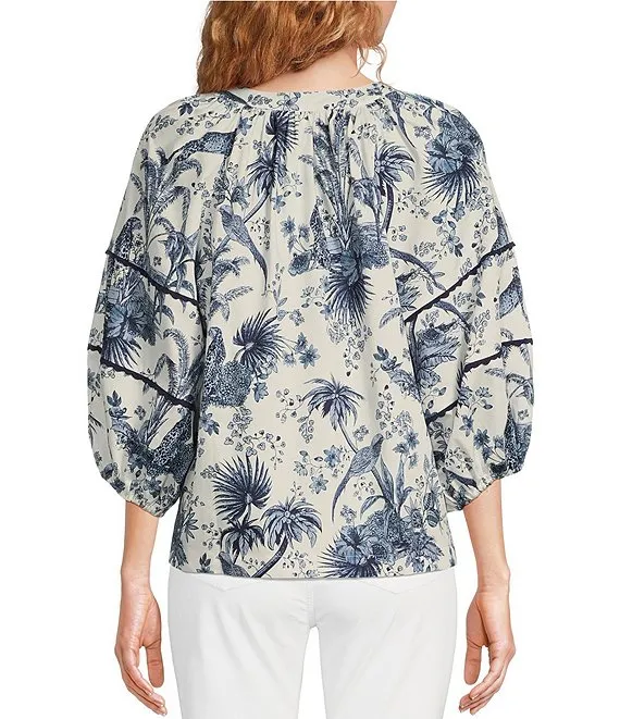 Molly Woven Toile Print Banded Split V-Neck 3/4 Balloon Sleeve Raglan Shoulder Lace Trim Top