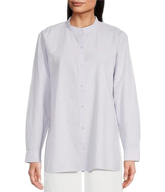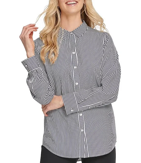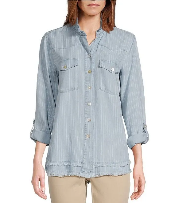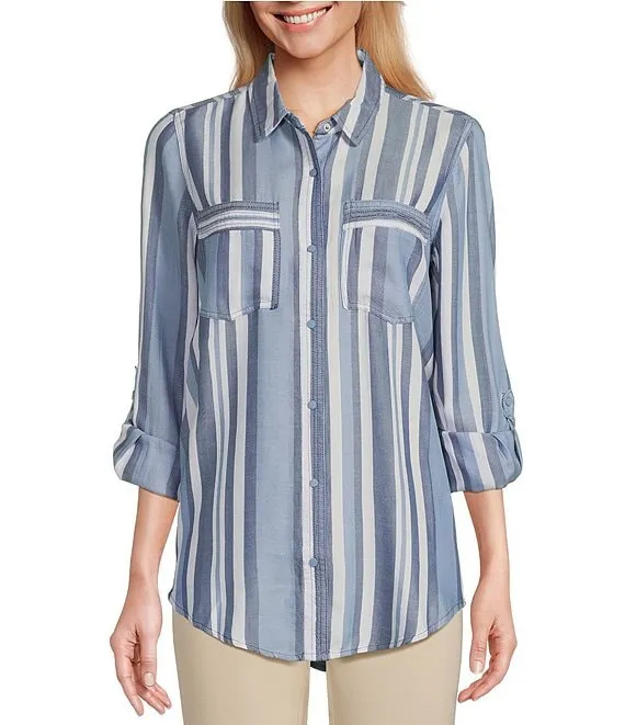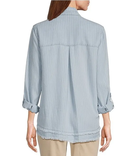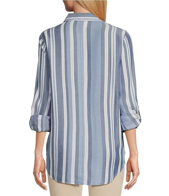 Woven Stripe Wire Collar Long Roll-Tab Sleeve High-Low Hem Button-Front Blouse