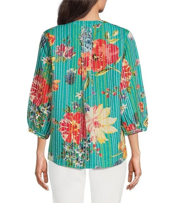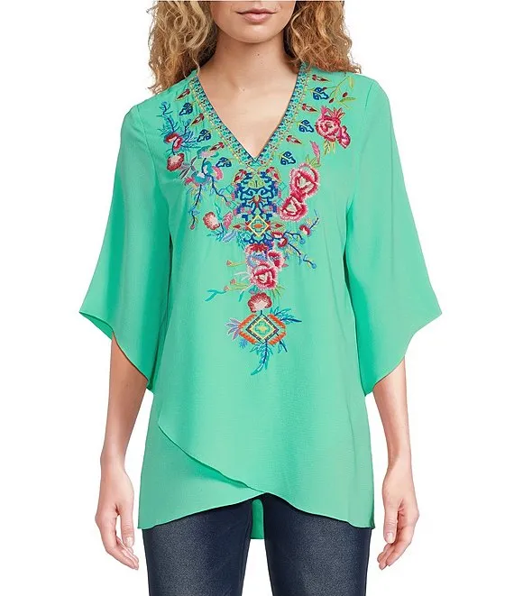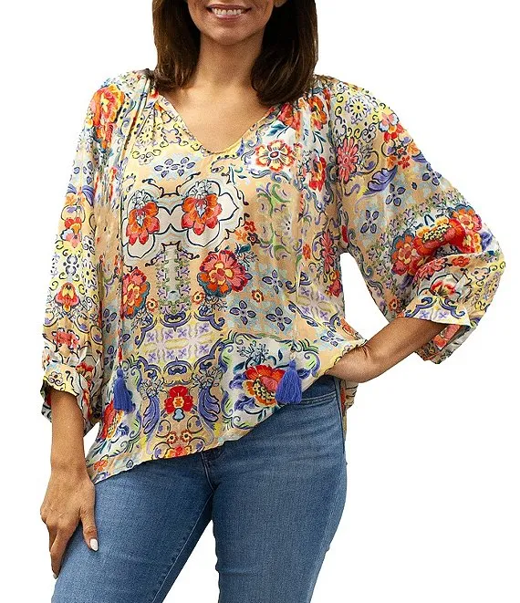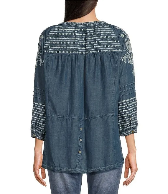 Embroidered Geometric Floral Split V-Neck 3/4 Sleeve Pintuck Tie Front Peasant Tunic