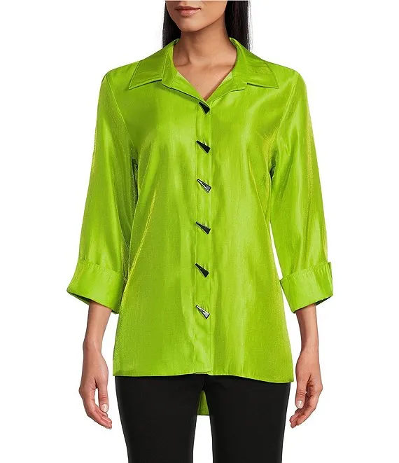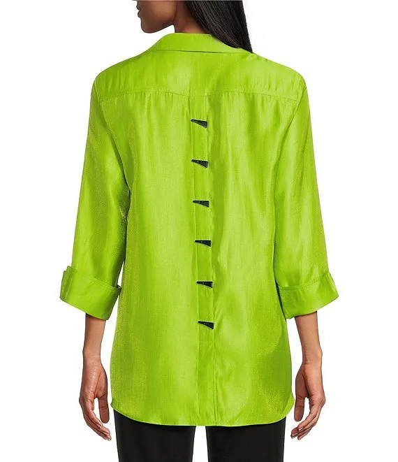 Shimmer Woven Collar Turn Up Cuff 3/4 Sleeve Button-Front Shirt