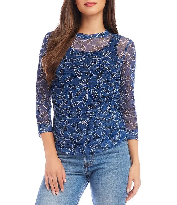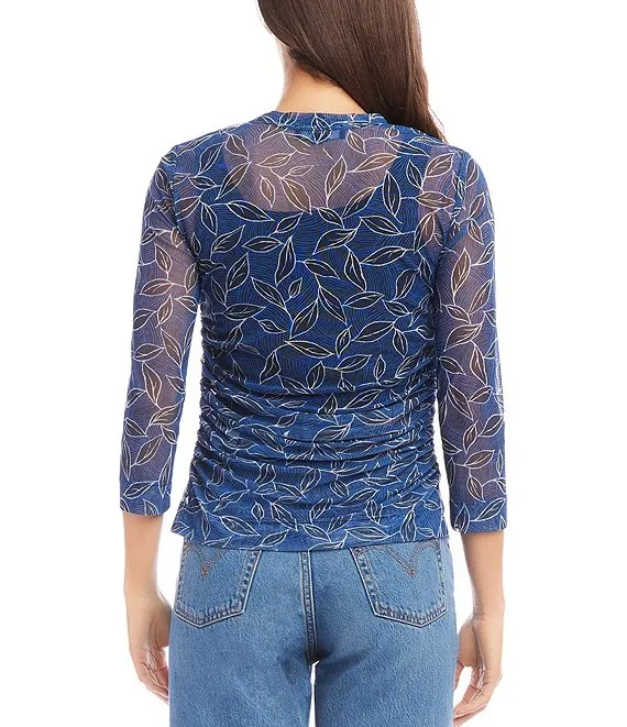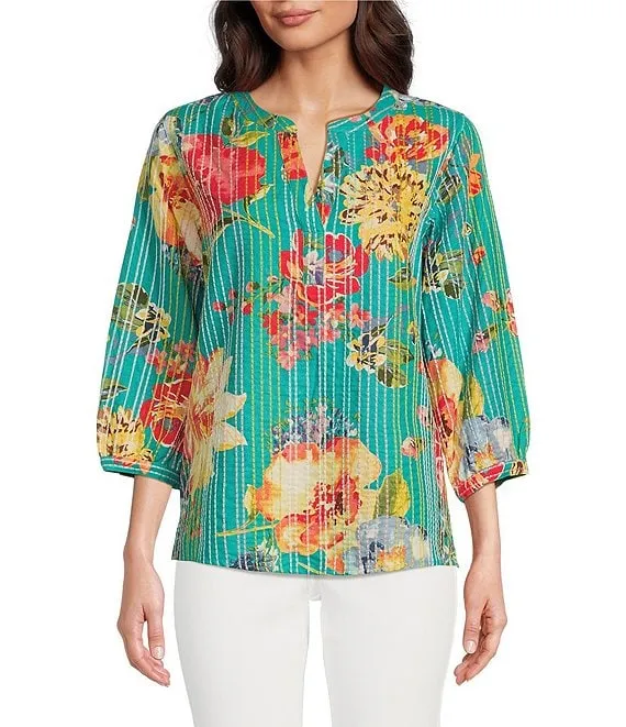 Floral Geometric Print Round Neck Notch 3/4 Sleeve Blouse