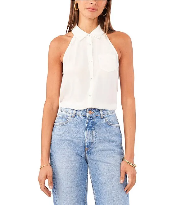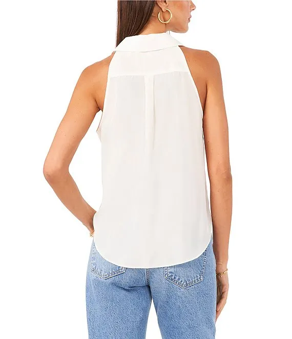 Point Collar Sleeveless Patch Pocket Button Front Blouse
