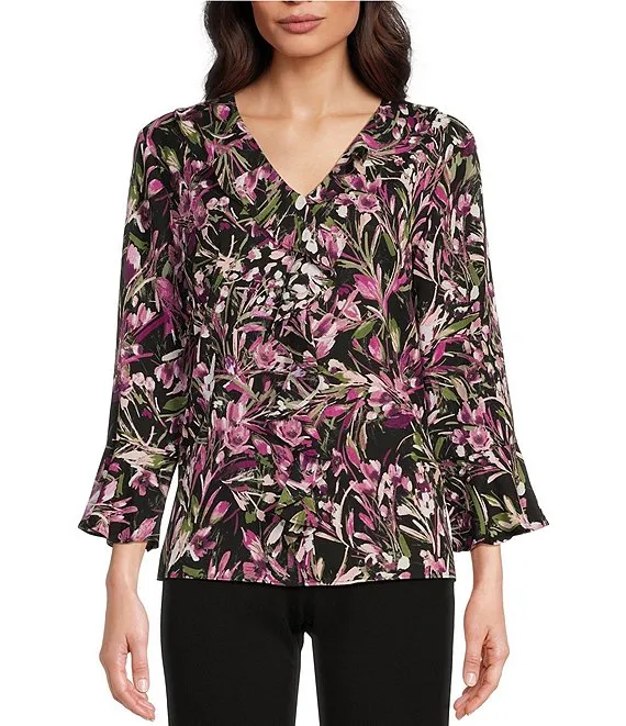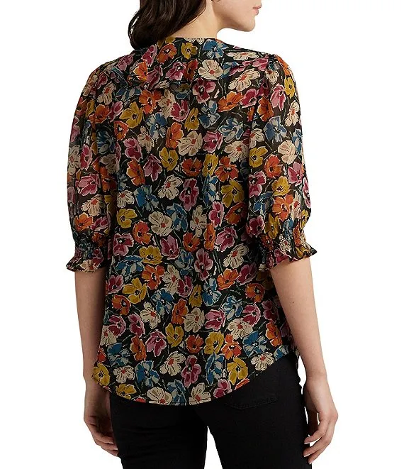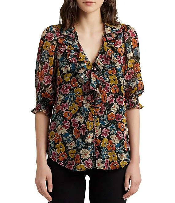 Lauren Ralph Lauren Floral Print Ruffled V-Neck 3/4 Sleeve Blouse