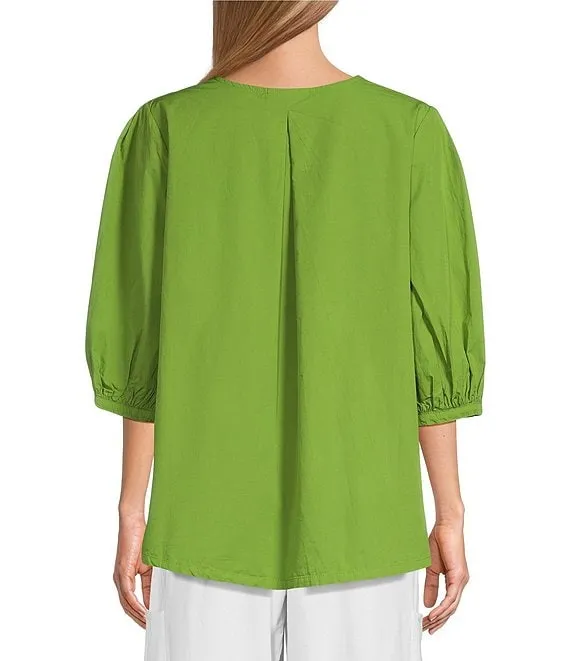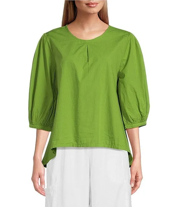 Lucinda Organic Cotton Poplin Crew Neck 3/4 Sleeve Hi-Low Hem Shirt