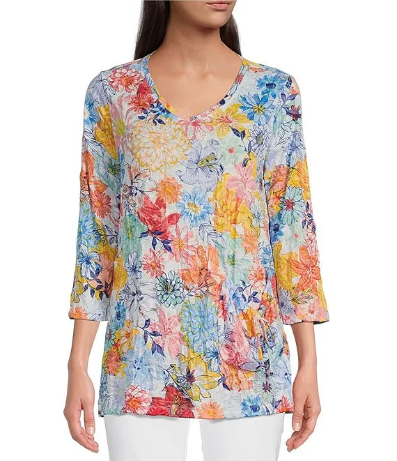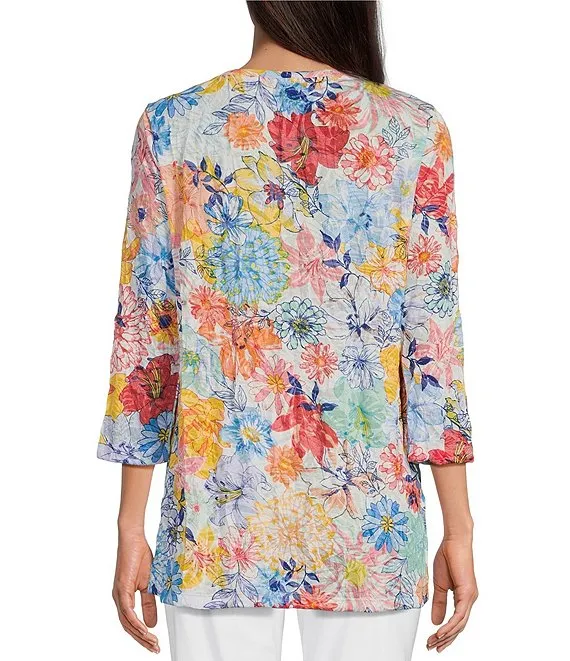 Floral Crinkle Burnout Knit V-Neck 3/4 Sleeve Tunic