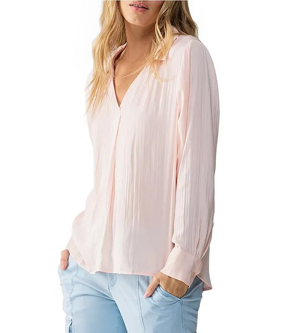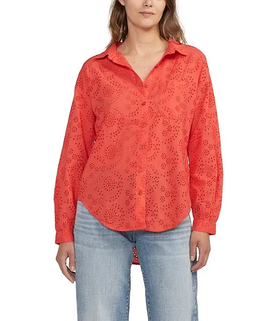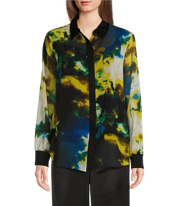 Woven Printed Point Collar Long Sleeve Button Front Blouse