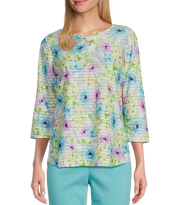 Floral Print 3/4 Sleeve Keyhole Round Neck Ruffle Knit Top