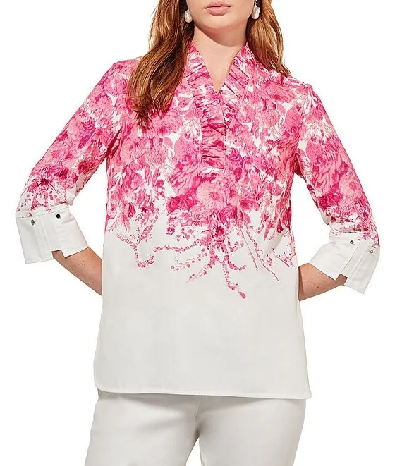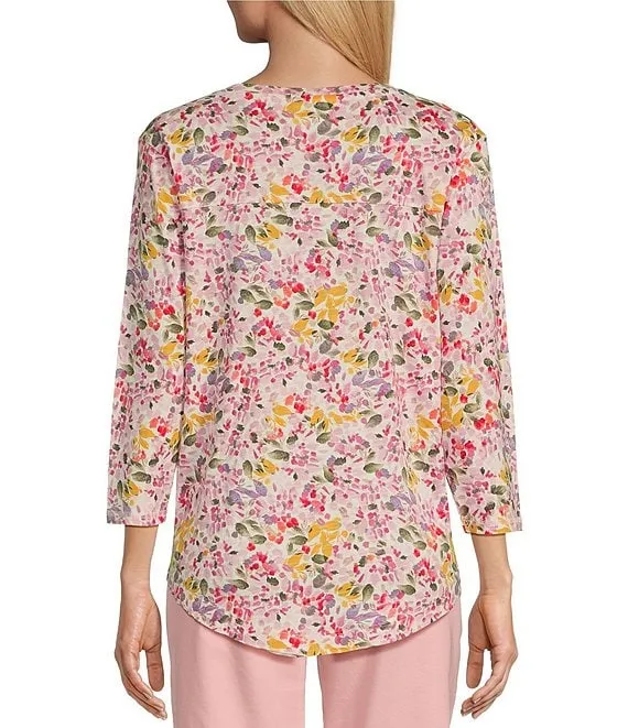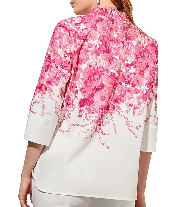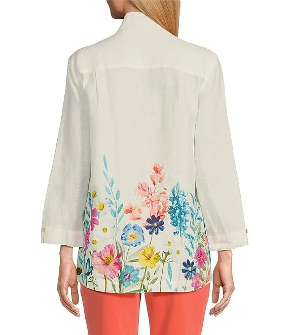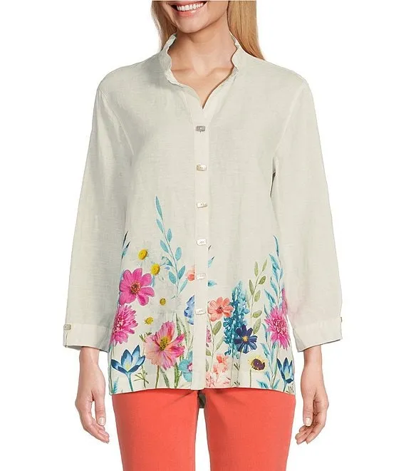 Floral Border Print Linen Wire Collar 3/4 Sleeves Button-Front Tunic