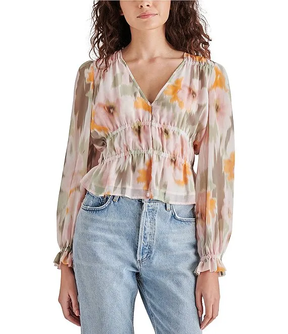 Ardenne Floral Print Chiffon V-Neck Long Sleeve Top