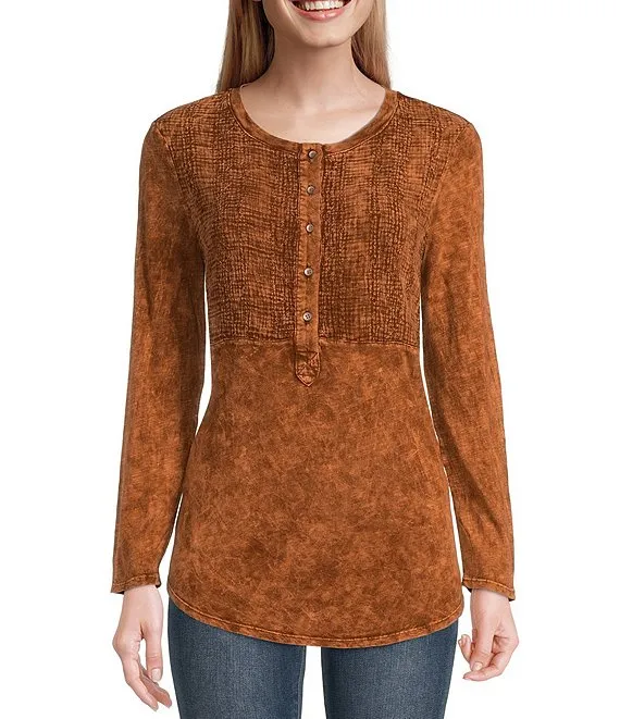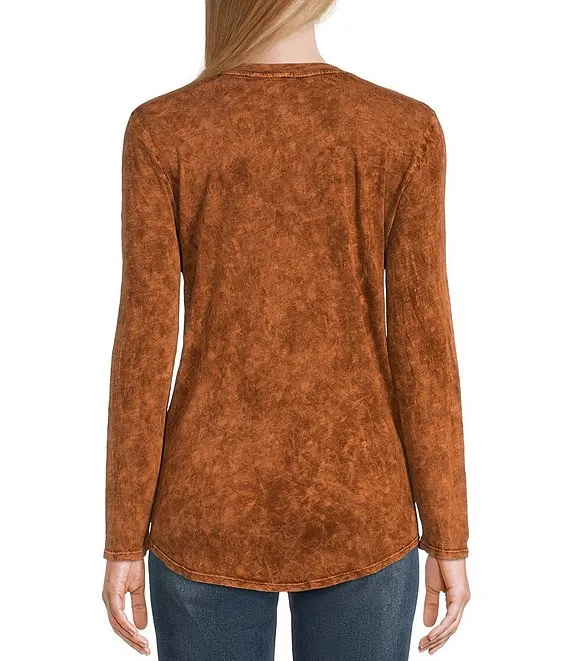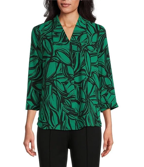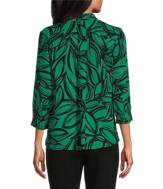 Caroline Signature Etched Leaves V-Neck 3/4 Sleeve Button Front Top