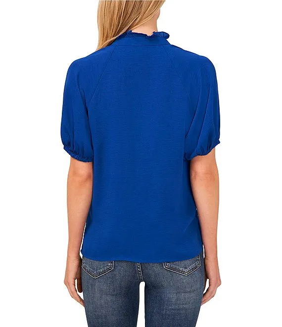 Drapey Gauze Ruffled Split V-Neck Short Puffed Sleeve Blouse