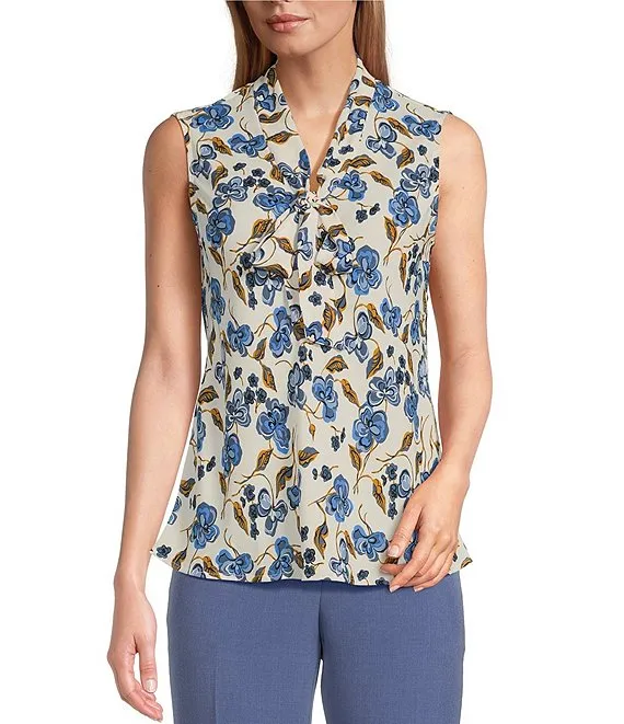 Kasper Floral Crepe Tie Front Neck Sleeveless Fitted Blouse