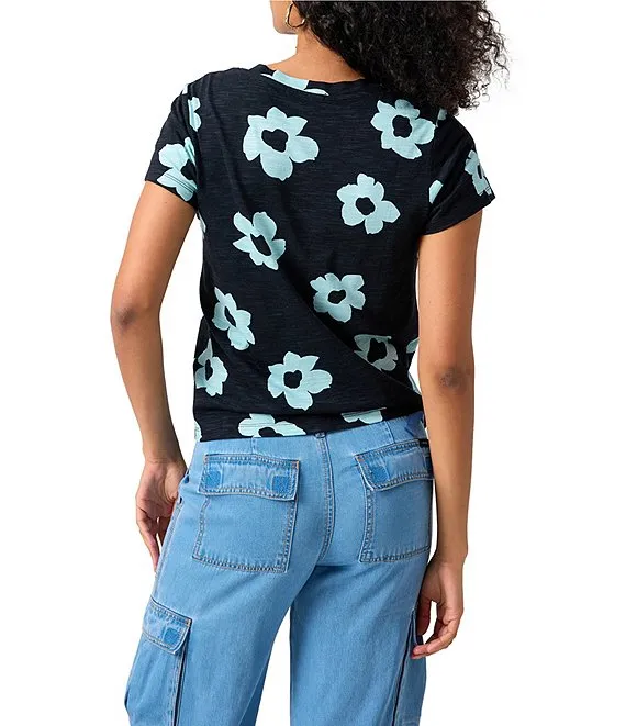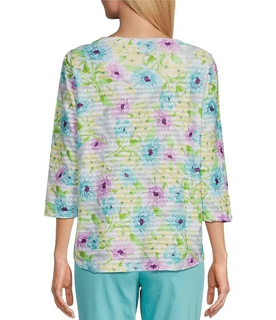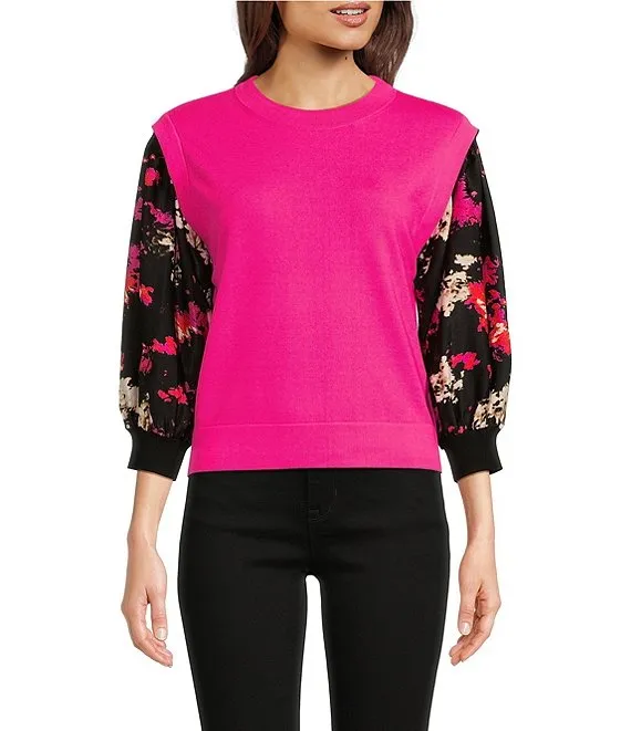 Knit Floral Print 3/4 Sleeve Crew Neck Top