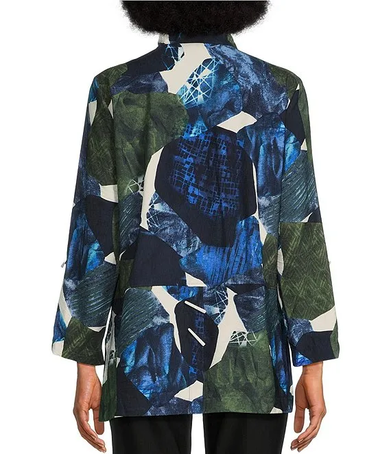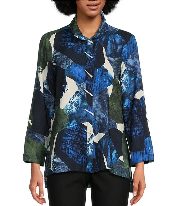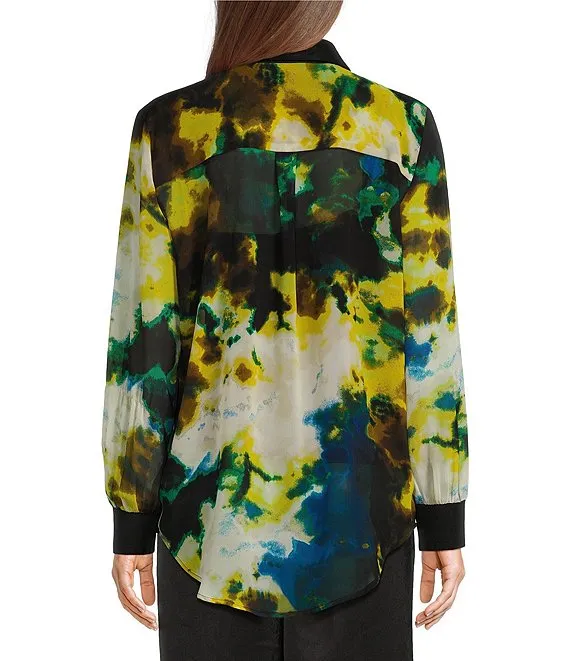 Abstract Printed Woven Point Collar Long Sleeve High-Low Hem Tunic