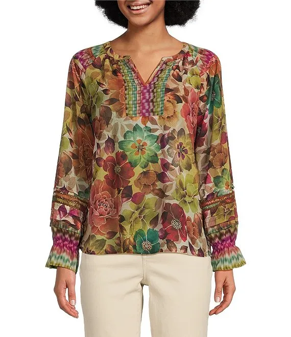 Floral Border Print Split Neck Flounce Cuff Long Blouson Sleeve Top