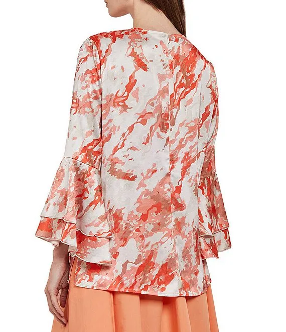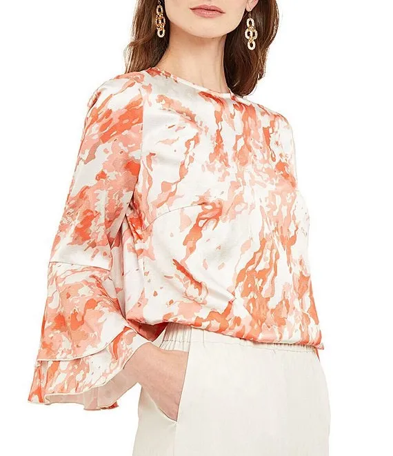 Crepe de Chine Abstract Print Crew Neck Tiered Ruffled Bracelet Sleeve Tunic
