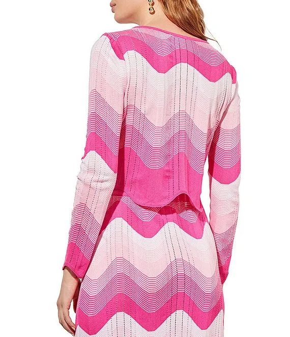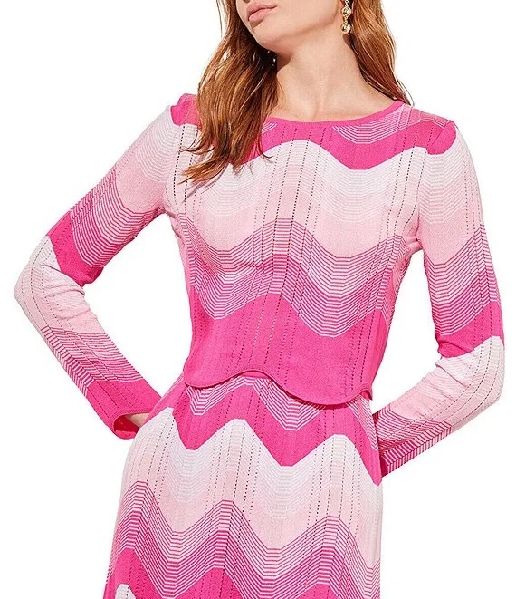 Knit Chevron Ombre Print Crew Neck Long Sleeve Cropped Scalloped Hem Coordinating Top